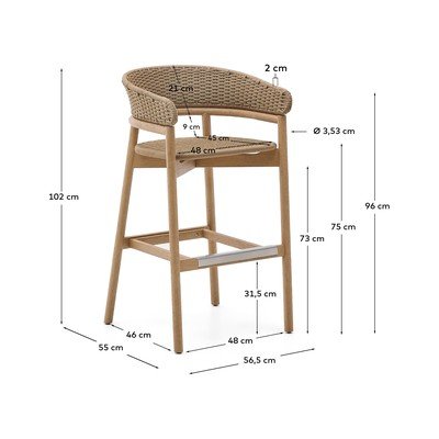 Barski stol Arinella znamke Kave Home je izdelan iz masivnega akacijevega lesa z naravnim premazom. Tako ima vsak kos edinstvene odtenke in lesno teksturo, kar mu daje poseben značaj.