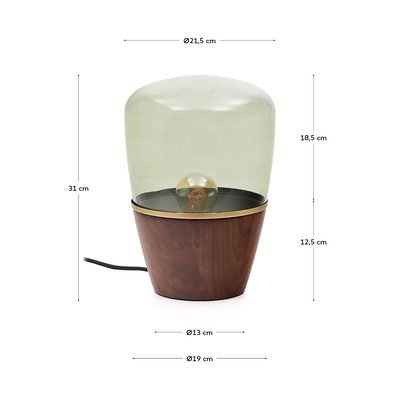 Namizna svetilka Silex iz Kave Home navdušuje s kombinacijo lesenega podstavka z orehovim furnirjem in zelenega steklenega senčila. Svetilka je visoka 30 cm in je združljiva z žarnicami E27 z največjo močjo 25 W. Žarnica ni priložena.