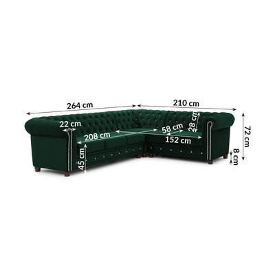 ŽametnaRaztegljivaChesterfieldDesni kot/v obliki črke LZelenaVodoodporna/odporna na madežeŠtirisedežnaŠirina 264 cm