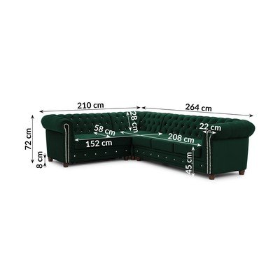 ŽametnaRaztegljivaChesterfieldLevi kot/v obliki črke LZelenaVodoodporna/odporna na madežeŠtirisedežnaŠirina 264 cm