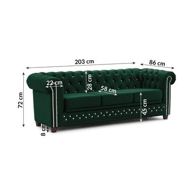 Žametna, raztegljiva, Chesterfield, zelena, vodoodporna/odporna na madeže, dvosedežna, širina 203 cm