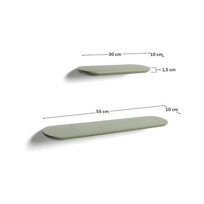 Polici sta izdelani iz MDF plošč z gladko lakirano površino. Zaradi tega sta trpežni in enostavni za vzdrževanje, kar zagotavlja elegantno rešitev za organizacijo vaših predmetov. Njuna podolgovata oblika z zaobljenimi vogali bo vaši notranjosti dala sodoben videz.