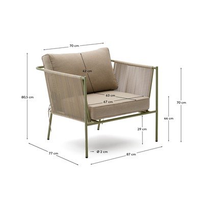 Vrtni fotelj Zivia znamke Kave Home je odlična izbira za sedenje na prostem. Njegova trdna konstrukcija je izdelana iz pocinkanega jekla, ki je odporno na rjo in korozijo, kar zagotavlja daljšo življenjsko dobo kot običajno jeklo. Fotelj je 100-odstotno primeren za zunanjo uporabo.